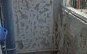 החלפת חיפוי קרמיקה בקירות מחסן בבניין.
