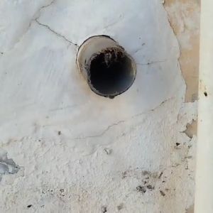 תיקון צינור ניקוז חיצוני לבניין שנפגע מהדף של טיל.