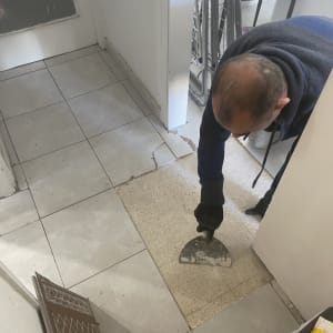 הדבקת אריחי קרמיקה בלובי בניין מגורים.