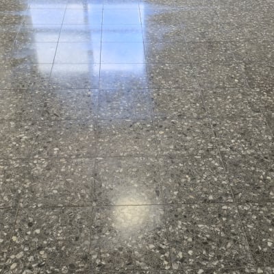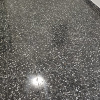 ליטוש ופוליש בדירה לא חדשה עם מרצפות טרצו שחורות עם כתם חומצה.