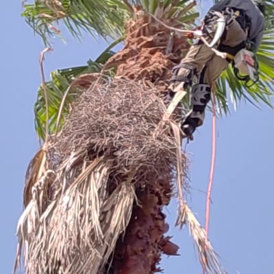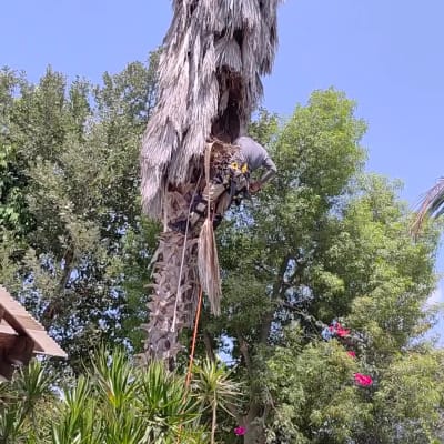 ניקוי דקל וושינגטוניה גבוה בסנפלינג בחצר בית פרטי.