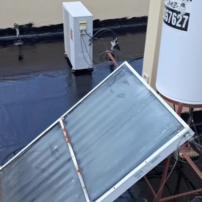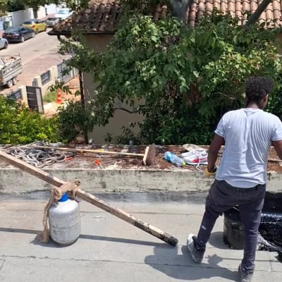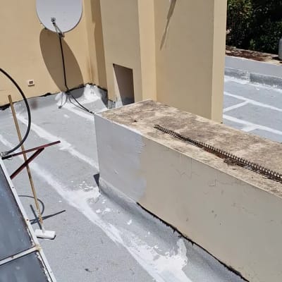 איטום גג שטוח באמצעות יריעות, זפת וצבע אקרילי.