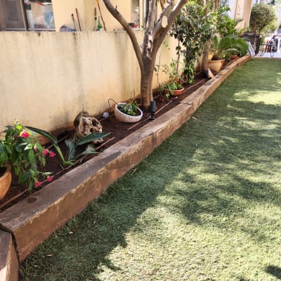 טיפול חד פעמי בגינה שכלל גזימת עצים, כולל תאורה מתח נמוך, חידוש צנרת השקיה ושתילה מחודשת.