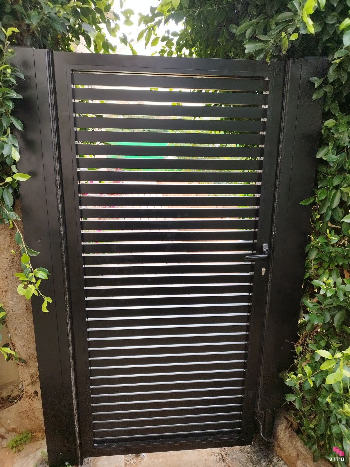 שער הייטק רגיל: מתאפיין בפסי אלומיניום אופקיים דקים, שמושחלים לתוך הפרופיל של הגדר באופן שמסתיר את נקודות החיבור שלהם.